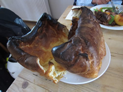 Ted Robinson and I were the only ones to opt for a Sunday roast so while the other sat in the carpark to enjoy the sunshine we went in for lunch, the barmaid brought out a plate each with two large slices of beef and some roast potatoes on them, this was followed by a dish of vegetables, Ted and I looked at each other wondering what had happened to the Yorkshire pudding when the chef came out with the biggest pudding you have ever seen, we ate as much of it as we could but the photo shows how much was left over, you will have to use your imagination as to how big it was before we started.