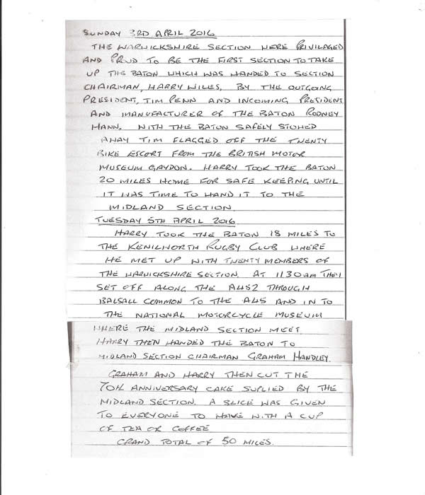 The Warwickshire Section took up the Baton at the AGM I have attached a scan of what I wrote in the Baton Diary and some photos.