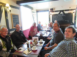 Another eight miles on I came across Alan Bailey but he had only stopped to put his waterproofs on, to save him strapping the bag he had his waterproofs in back on the bike in the rain, which by now was quite heavy, I put those in the car along with the Suzuki side panels. I caught up with Alan just before the Three Horse Shoes at Princethorpe where we were having breakfast, as I drove into the carpark I noticed an extra bike lined up with the others, Dave Kendall had got held up on the way to the start when he went to get petrol and got to the start just after I had left so in the end ten of us sat down to a hearty breakfast.