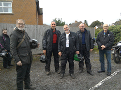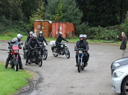 Despite a forecast of rain and high winds, seven bikes and one pillion signed on at the Kenilworth Rugby Club. The usual stalwarts were there: Simon Dudfield (‘28 AJS), Derek Morris (‘47 Ariel NG), Neil Ives (‘55 BSA A10), Andy Smith on his first Autumn Run (‘55 Velo Venom), David Kendall (‘59 Norton ES2), Malcolm and Judith (Honda ‘82 CB250 RSA) and Peter Brown (‘87 Honda VT500). Rikki Richardson had come by car to wave us off, a broken left wrist preventing him from using his Royal Enfield’s clutch. Thank you Rikki.