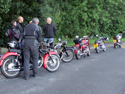 Five machines set off at 7 am in cool dry weather from the lay-by on the A428 close to junction 11 of the M40: Derek Morris’ ‘47 Ariel Ng, Alan Bailey’s ‘56 Ariel Fieldmaster, Malcolm Griffin’s ‘59 BSA Golden Flash, Ted Robinson’s ‘80 Honda CD200 and Andrew Rae’s ‘91 MZ 301E. The route took us across to Hampton Lucy (where we saw someone walking dressed in what looked like a Monks habit), passing Wellesbourne, then through Ettington along the A322 up Sunrising – practise for the following Sundays’ Banbury Run for two of us, albeit on more modern machines. At the top we turned off through Edge Hill, down past CAD Kineton into Gaydon, onto Pimple Lane, by-passing Knightcote and into Bishops Itchington. Then across onto the Fosse Way, up to the Long Itchington turn, down Snowford Hill, turning left for Birdingbury, thinking “back here in 4 week’s time for the Birdingbury Festival”. Never get chance to get bored! Then through Bourton on Dunsmore and finishing at the Three Horseshoes at Princethorpe, having covered a very pleasant 46 miles in an hour and three quarters.