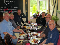 The landlady Ann must have been watching out for us – as we rode into the car park, she ran out to arrange our parking for a photo shoot, and then sat us down for well earned breakfast of fried eggs, sausage, bacon, baked beans, hash browns and mushrooms, together with toast and lots of strong coffee. Those who didn’t show up missed a treat!