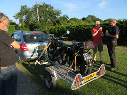The Chairman’s Social is just what it says, an evening social meet at the Blue Lias Long Itchington with a get to together and a buffet. Unfortunately the chairman’s bike packed up on the way to the Blue Lias and he had to go home and get his trailer, as can be seen in one of the Photos. The weather was excellent which brought out twenty bikes ranging from Gordon Smith’s 1923 Rudge to Martin Robert’s 1977 Kawasaki and many different makes in between, some with pillion passengers. A very pleasant evening was had by all.